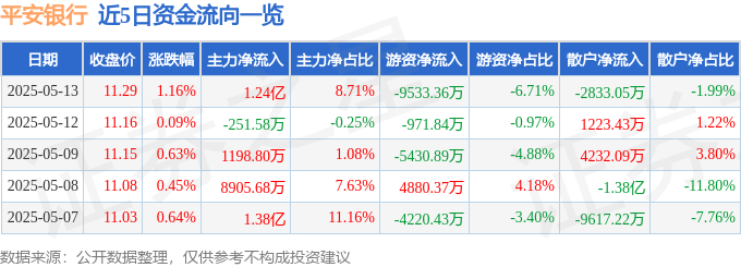 本站消息,截至2025年5月13日收盘,平安银行(000001)报收于11.29元,上涨1.16%,换手率0.65%,成交量126.1万手,成交额14.21亿元。